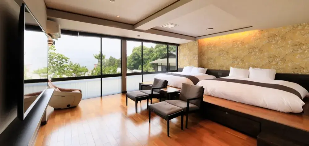 客室は、島内一の眺望を誇る海側客室をはじめ、和と洋の様々なタイプをご用意。