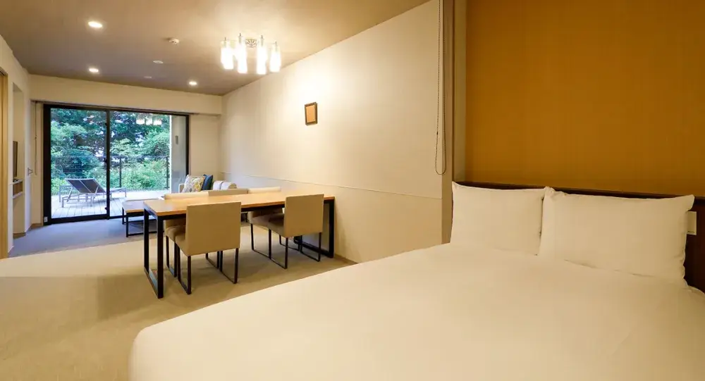 全22室の特別な空間は、すべてに露天風呂と森を望むテラスを備え、1階にはプライベートドッグランも。