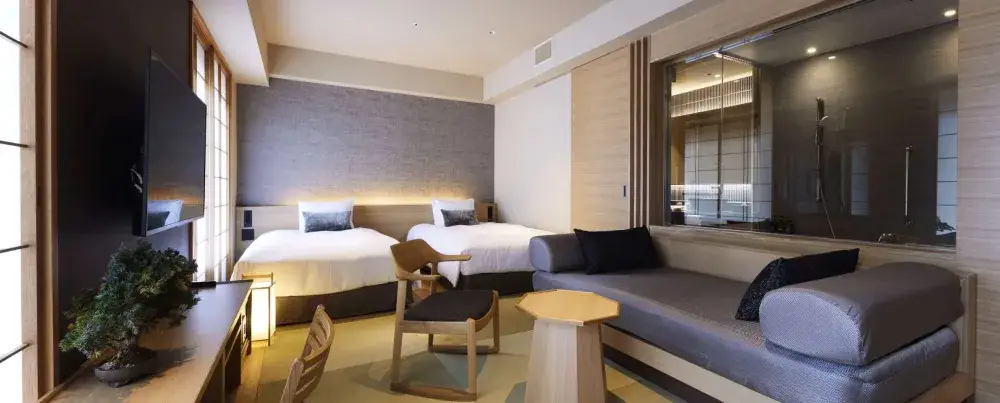 館内は、木組み、障子、和紙など日本の伝統美に彩られ、都会の喧騒を忘れる静寂に満ちた時間が流れています。障子越しの柔らかな光が差し込む客室は、心から安らげる居心地のよさです。